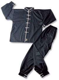 Kung fu uniform black. In 8-OZ drill 100% cotton dyed With white neck & cuff. Normal pant with white cotton Belt.